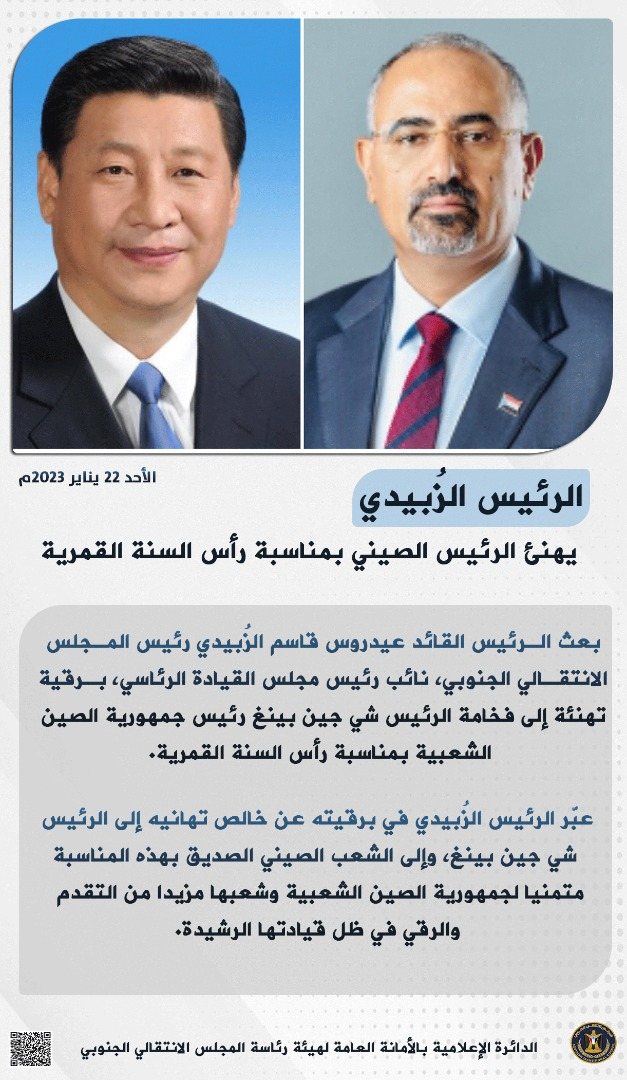 حفظ الصورة الرئيس الزُبيدي يهنئ الرئيس الصيني بمناسبة رأس السنة القمرية الإثنين ٢٣ يناير ٢٠٢٣ الساعة ١٢:٤٨ صباحاً الرئيس الزُبيدي يهنئ الرئيس الصيني بمناسبة رأس السنة القمرية