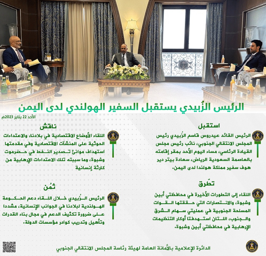 حفظ الصورة الرئيس الزُبيدي يستقبل السفير الهولندي لدى اليمن الإثنين ٢٣ يناير ٢٠٢٣ الساعة ١٢:٥٠ صباحاً الرئيس الزُبيدي يستقبل السفير الهولندي لدى اليمن
