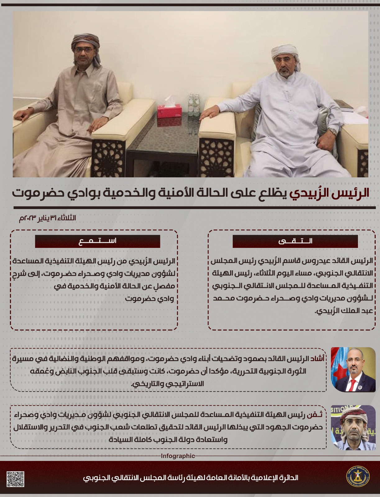 الرئيس الزُبيدي يطّلع على جهود تطبيع الأوضاع وتثبيت دعائم الاستقرار بالمهرة وسقطرى استقبل الرئيس القائد عيدروس قاسم الزُبيدي، رئيس المجلس الانتقالي الجنوبي، نائب رئيس مجلس القيادة الر...