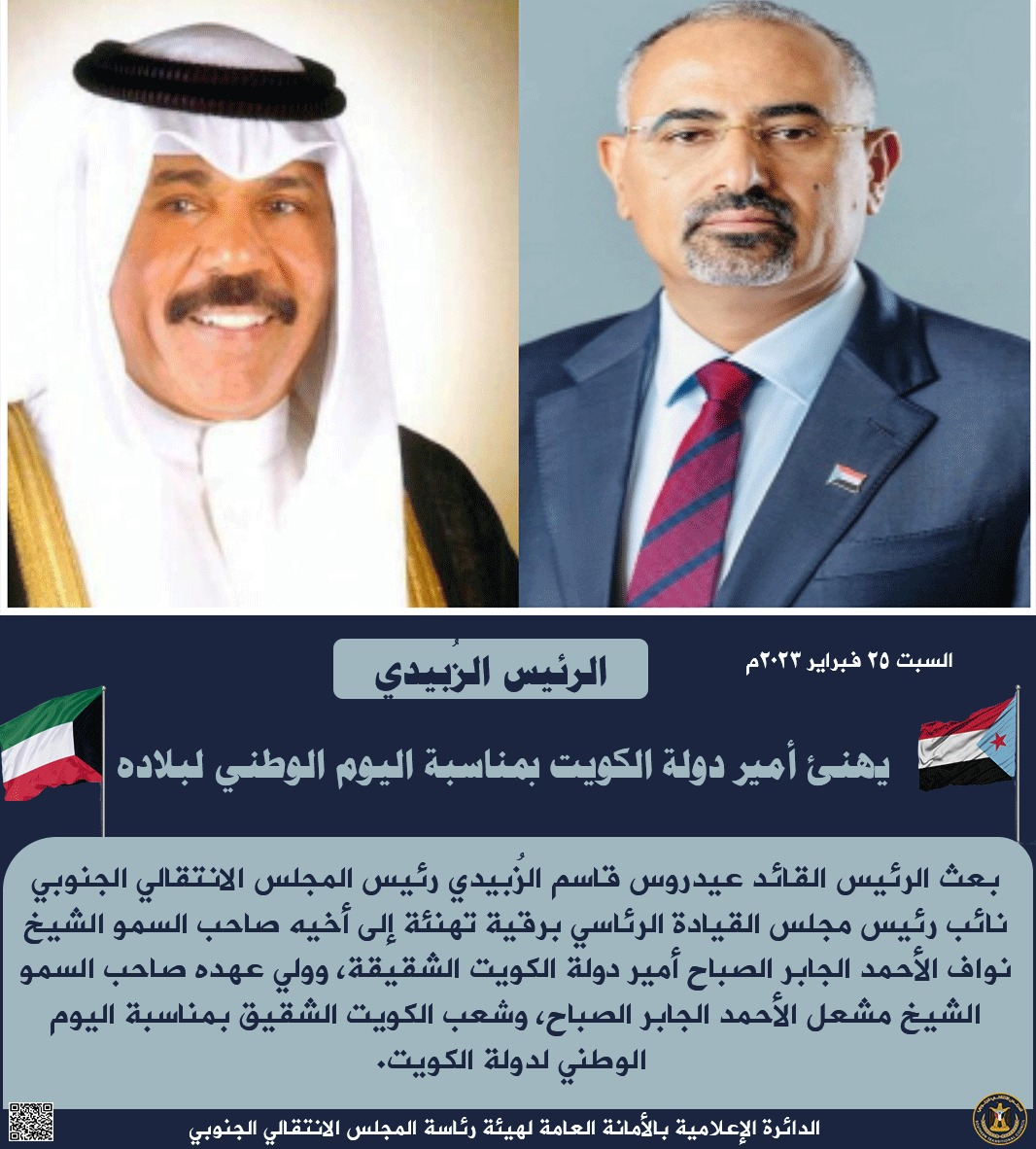 حفظ الصورة الرئيس الزُبيدي يهنئ أمير دولة الكويت بمناسبة اليوم الوطني لبلاده السبت ٢٥ فبراير ٢٠٢٣ الساعة ١٠:٥٠ مساءً الرئيس الزُبيدي يهنئ أمير دولة الكويت بمناسبة اليوم الوطني لبلاده