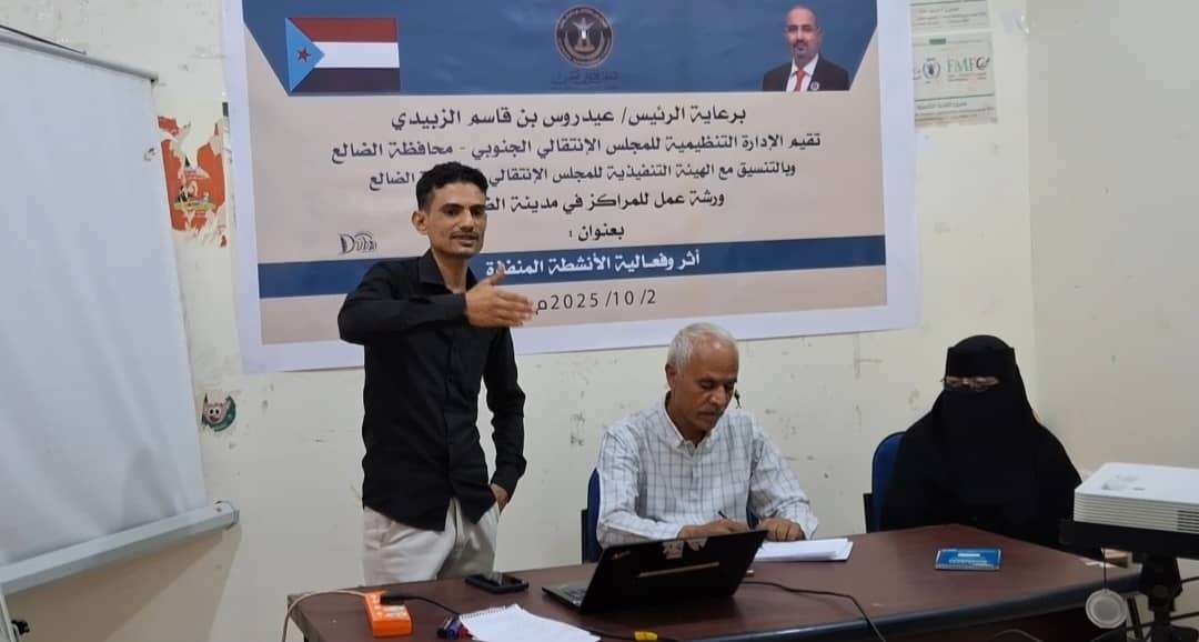 نظمت الإدارة التنظيمية بالهيئة التنفيذية للقيادة المحلية للمجلس الانتقالي الجنوبي في محافظة الضالع، اليوم الخميس، ورشة عمل بعنوان "أثر وفعالية الأنشطة المنفذة"، استهدفت رؤساء اللجان المحلية للمجلس في مراكز مديرية الضالع.