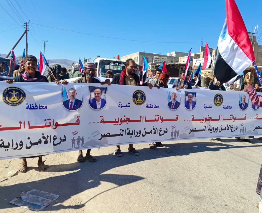 انتقالي حبان ينظم مسيرة جماهيرية احتفالًا بانتصارات القوات الجنوبية في عارين وحضرموت