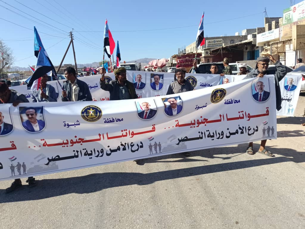 نظمت القيادة المحلية للمجلس الانتقالي الجنوبي في مديرية حبان بمحافظة شبوة، اليوم الأحد، مسيرة جماهيرية حاشدة في جول حبان، احتفالاً بالانتصارات التي حققتها القوات المسلحة الجنوبية في عارين بشبوة، ومديريات وادي وصحراء حضرموت.