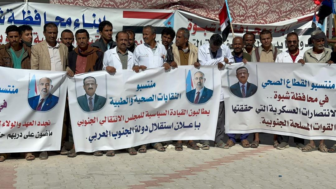 أعلنت النقابات الطبية والصحية بمحافظة شبوة، اليوم السبت، انضمامها إلى مخيم الاعتصام المفتوح في مدينة عتق، مؤكدين دعمهم لإجراءات المجلس الانتقالي الجنوبي، والسلطة المحلية، والمطالبة بسرعة إعلان دولة الجنوب.