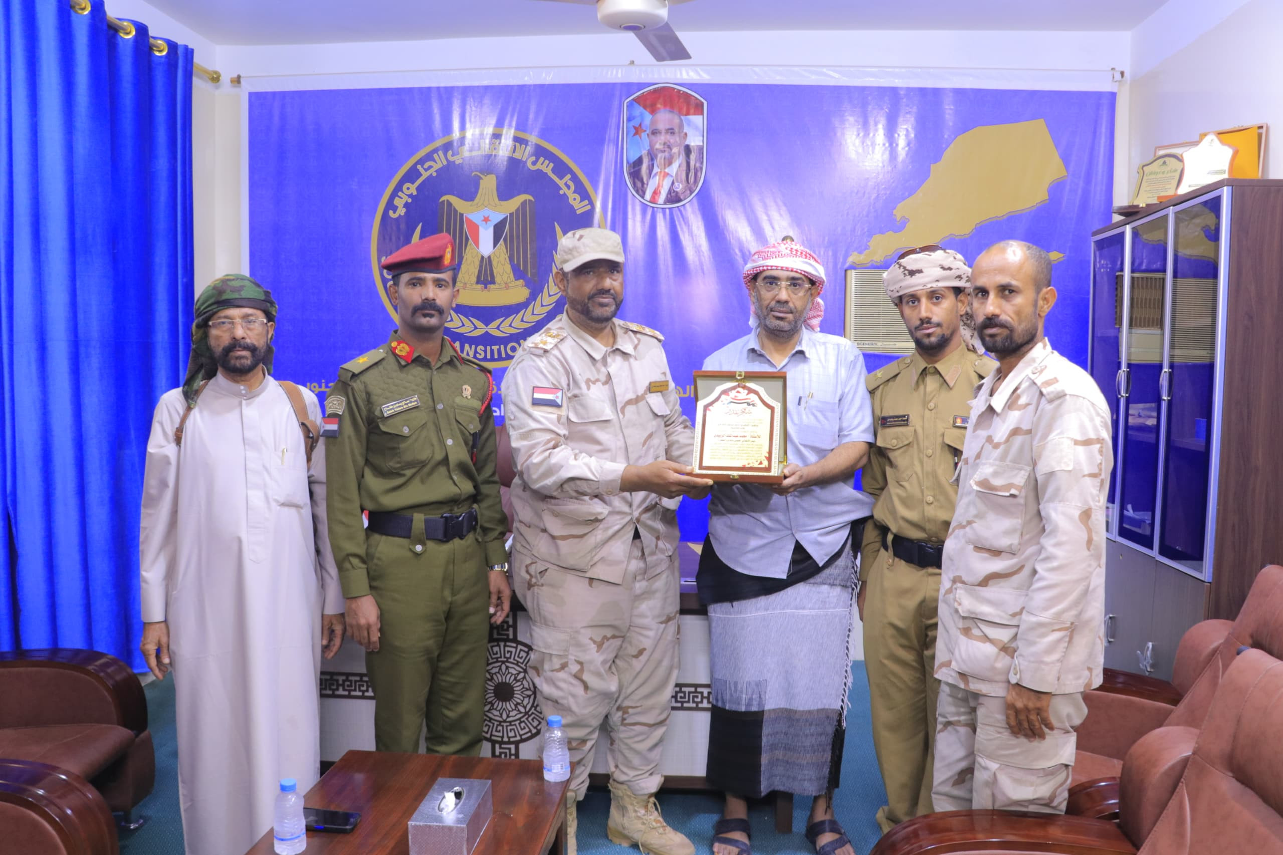 وجرى خلال اللقاء تسليم الزبيدي درع شكر وتقدير من قيادة وضباط وصف وجنود كتيبة النخبة مشاة المستقلة بمعسكر العند، تقديراً لجهوده الكبيرة ودوره البارز في دعم الانتصارات العسكرية، وتثبيت الأمن والاستقرار في وادي وصحراء حضرموت، متمنين له المزيد من التوفيق والنجاح في مهامه الوطنية.