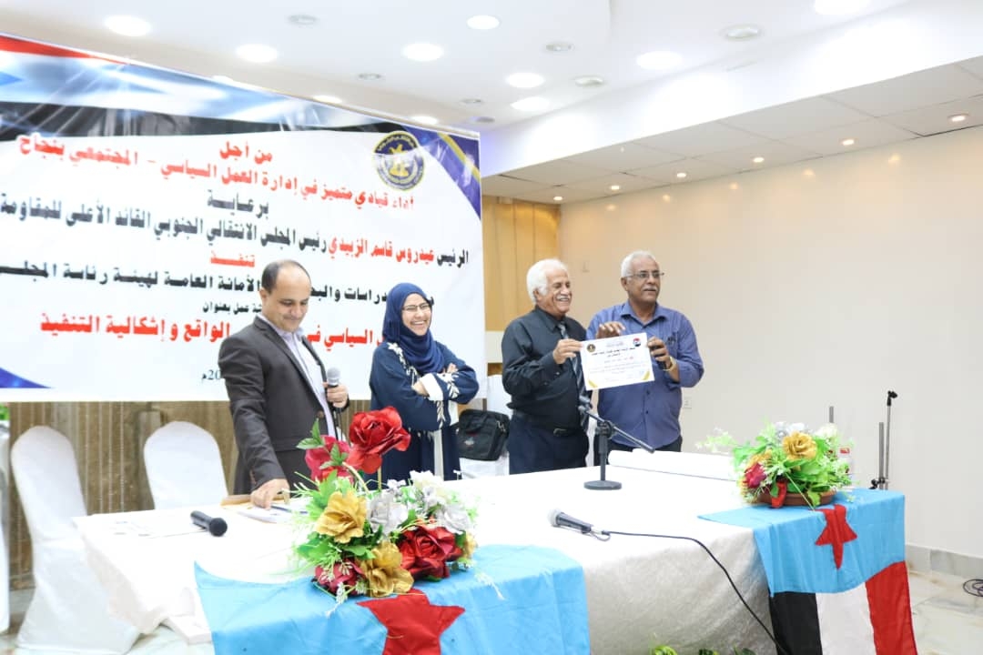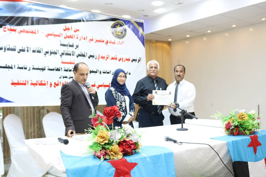 اختتمت دائرة الدراسات و البحوث في الأمانة العامة لهيئة رئاسة المجلس الانتقالي الجنوبي، صباح اليوم الخميس ، ورشة "العمل السياسي في الميدان.. واقع وإشكالية التنفيذ"، بحضور المحامية نيران سوقي، عضو هيئة رئاسة المجلس.